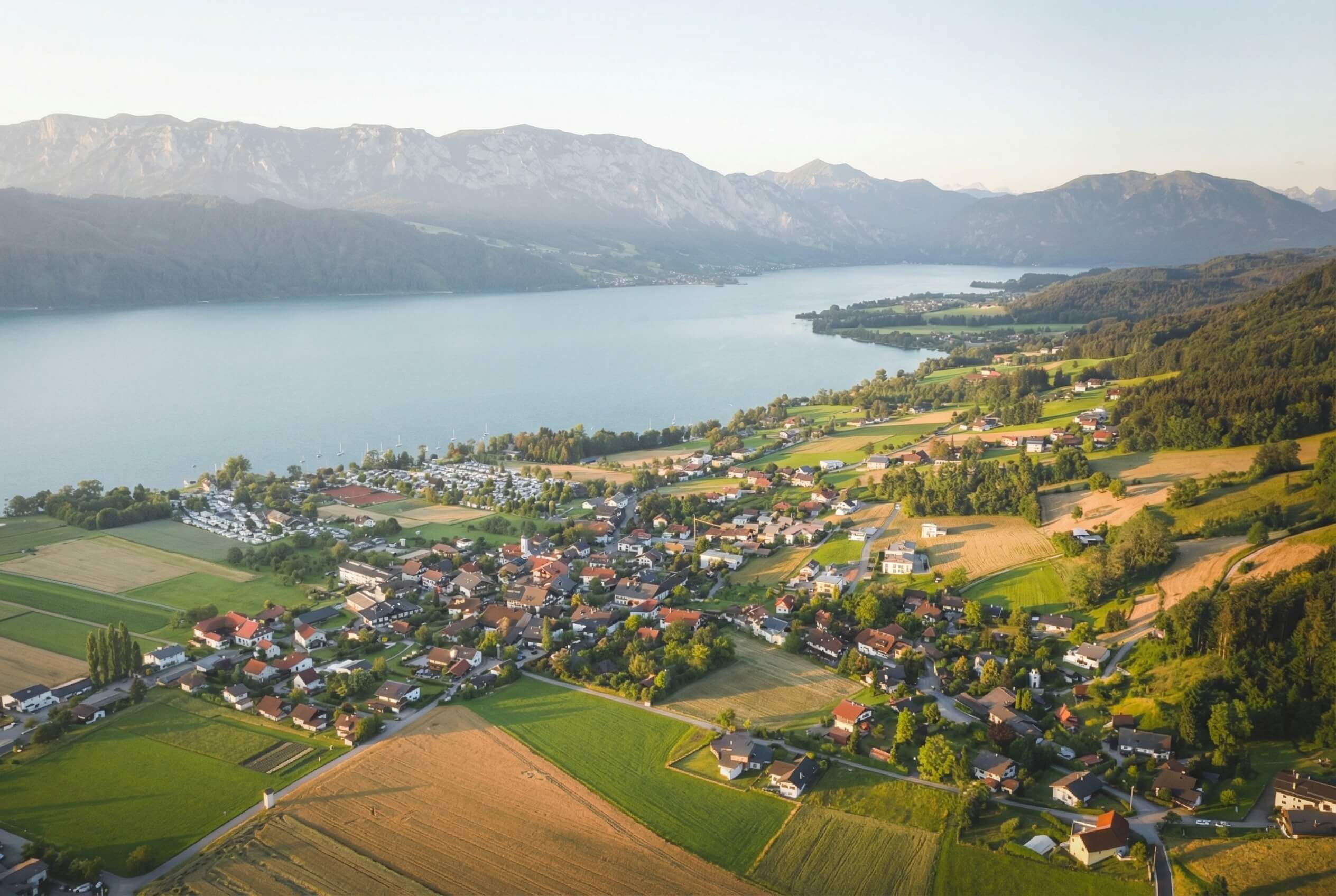 Die drei Häuser entstehen am nördlichen Ortsrand von Nußdorf am Attersee in sonniger Hanglage mit beeindruckendem Blick auf den Attersee und das Höllengebirge. Der Ortskern mit Gastronomie, Dorfmarkt und Nahversorger ist fußläufig erreichbar, ebenso der Golfclub Attersee. Baden, Wassersport, Wandern und Golf liegen praktisch vor der Haustür.