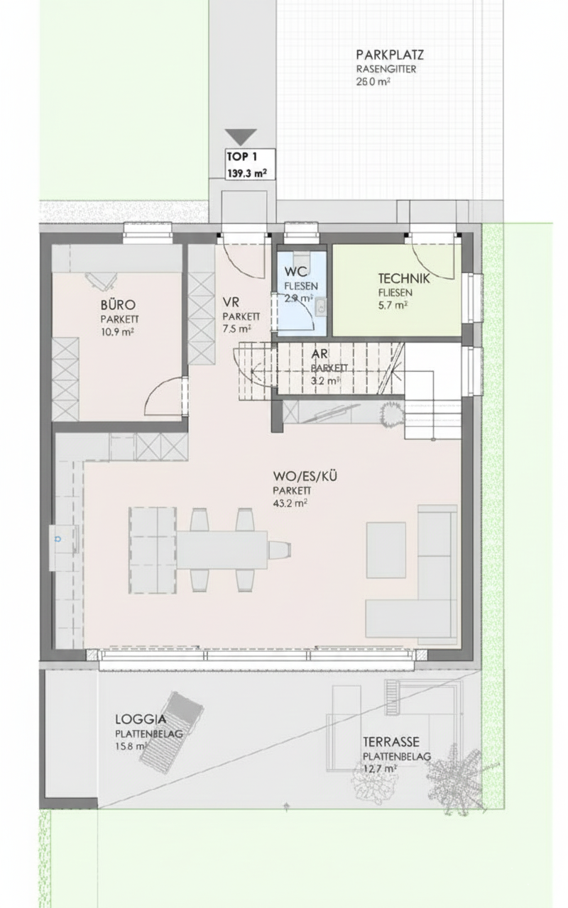 Familienfreundliches Reihenhaus mit ca. 140 m² Wohnfläche auf zwei Ebenen, 5 Zimmern, zwei Bädern, Hauswirtschaftsraum, Technikraum, Eigengarten, überdachter Terrasse und zwei PKW-Stellplätzen.
