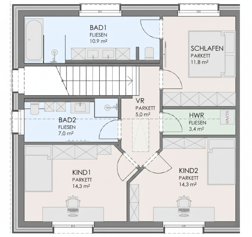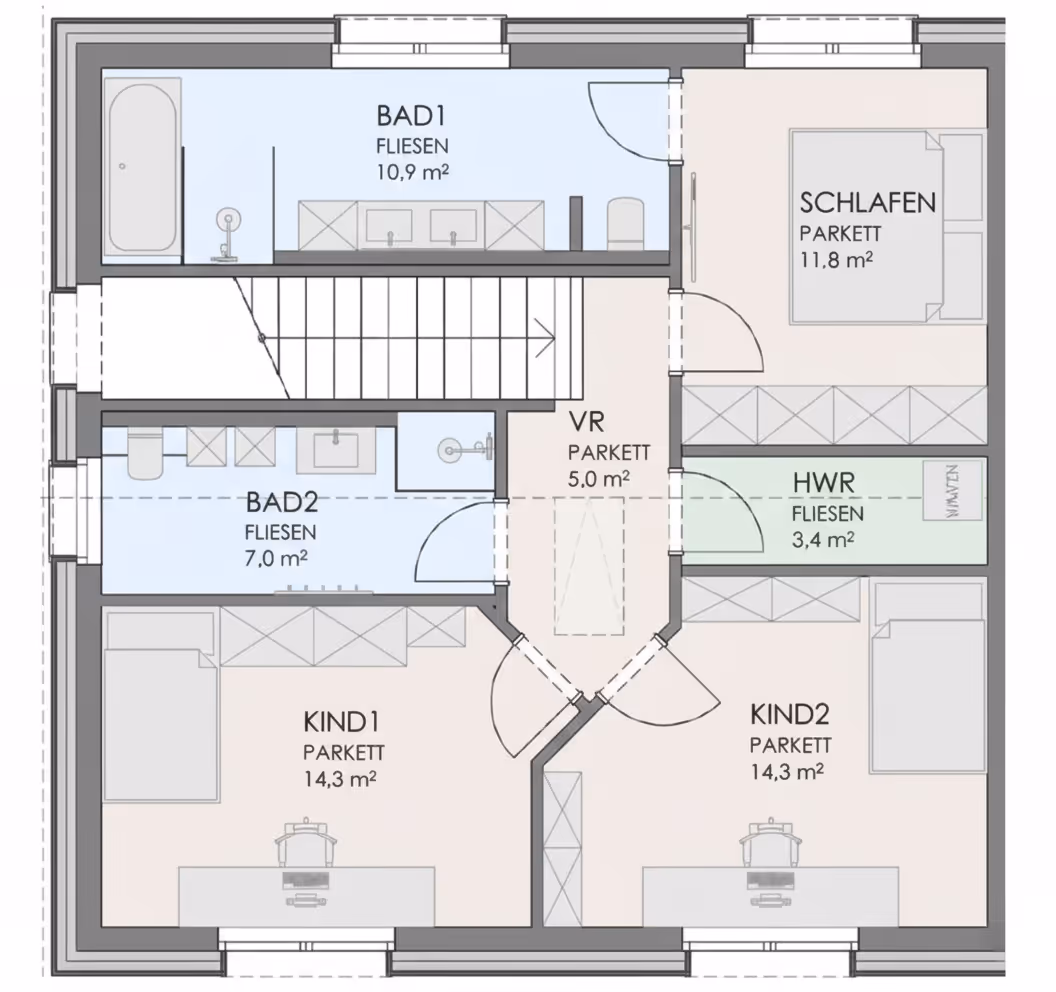 Familienfreundliches Reihenhaus mit ca. 140 m² Wohnfläche auf zwei Ebenen, 5 Zimmern, zwei Bädern, Hauswirtschaftsraum, Technikraum, Eigengarten, überdachter Terrasse und zwei PKW-Stellplätzen.